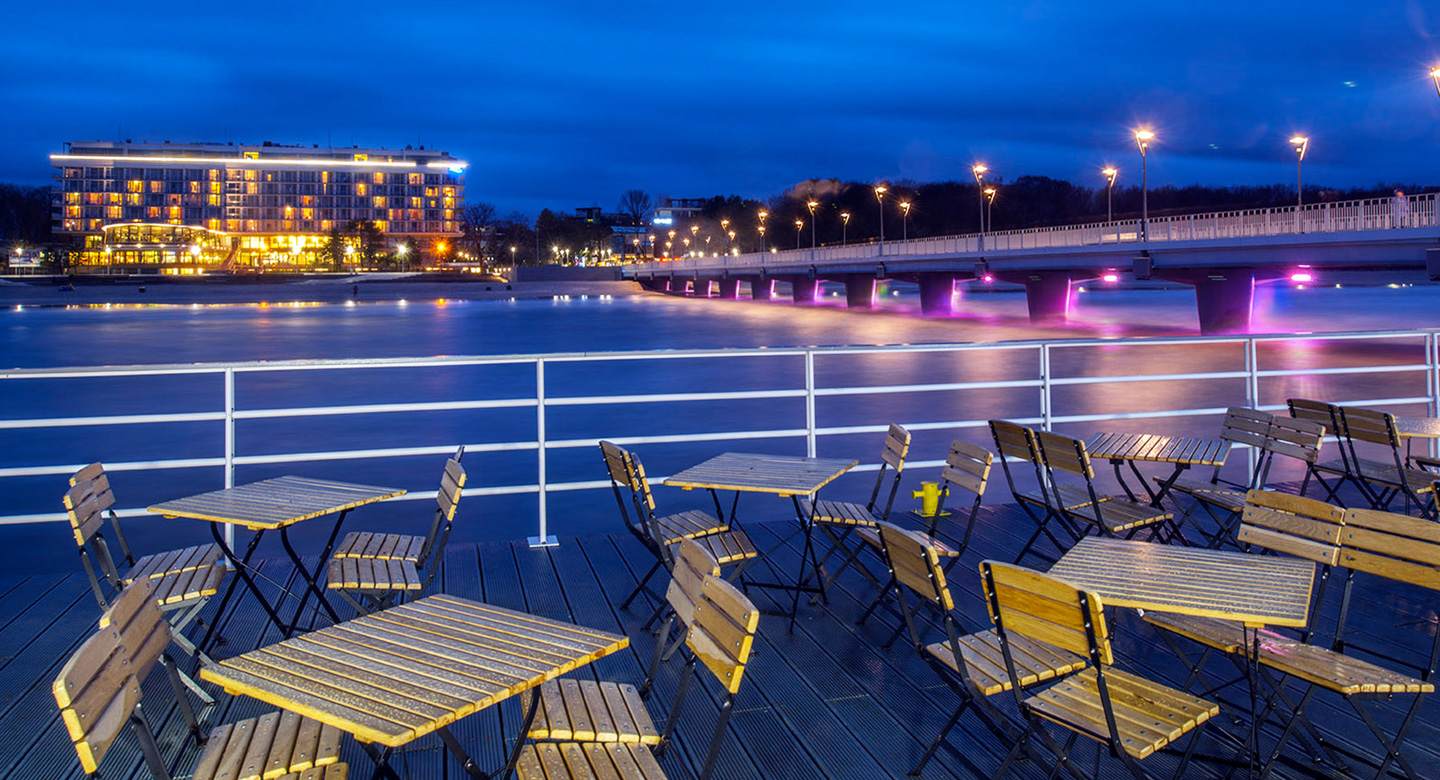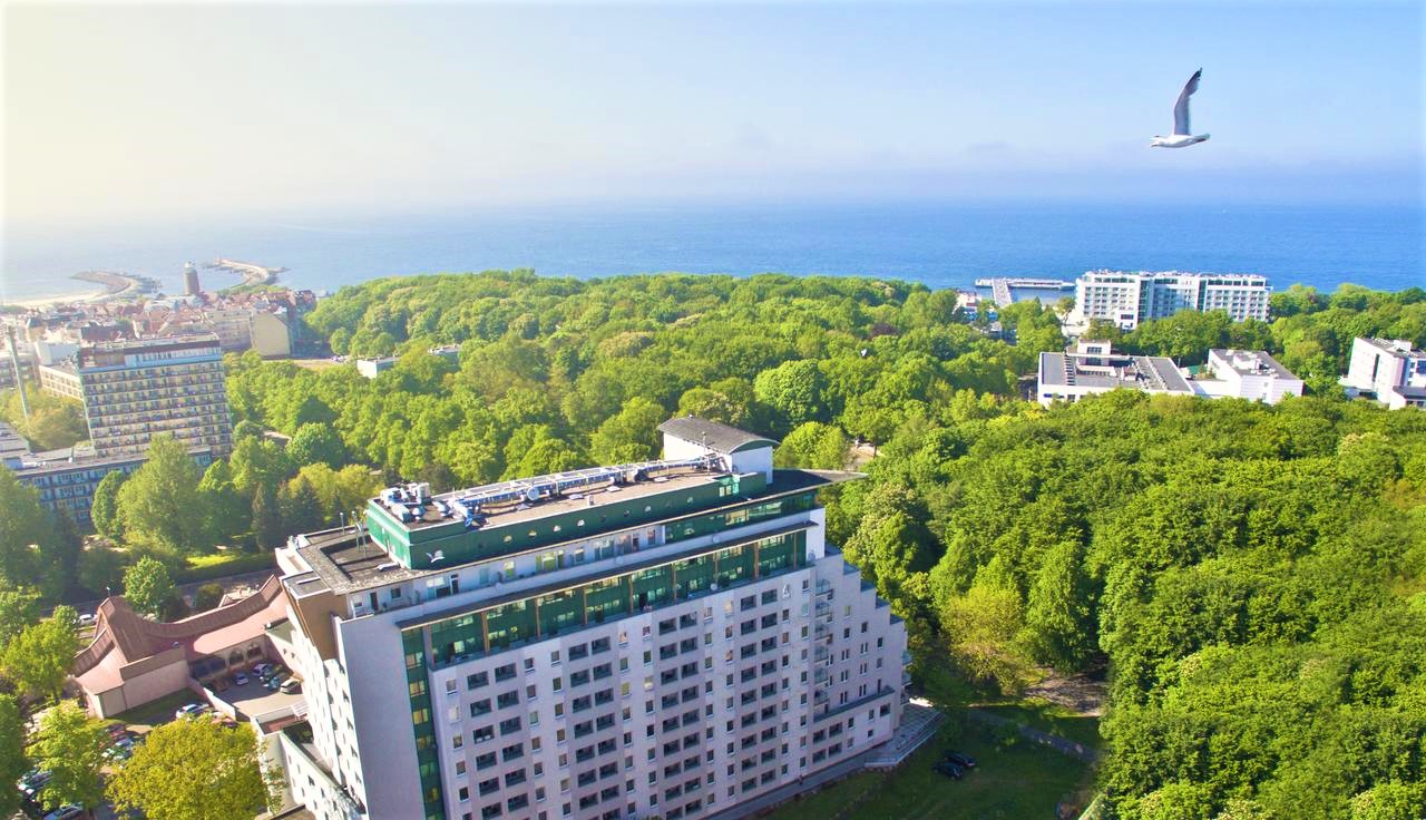 Oferujemy zakwaterowanie w nowoczesnym zbudowanym na kształt statku, obiekcie uzdrowiskowym, położonym w środku pięknego parku nadmorskiego.